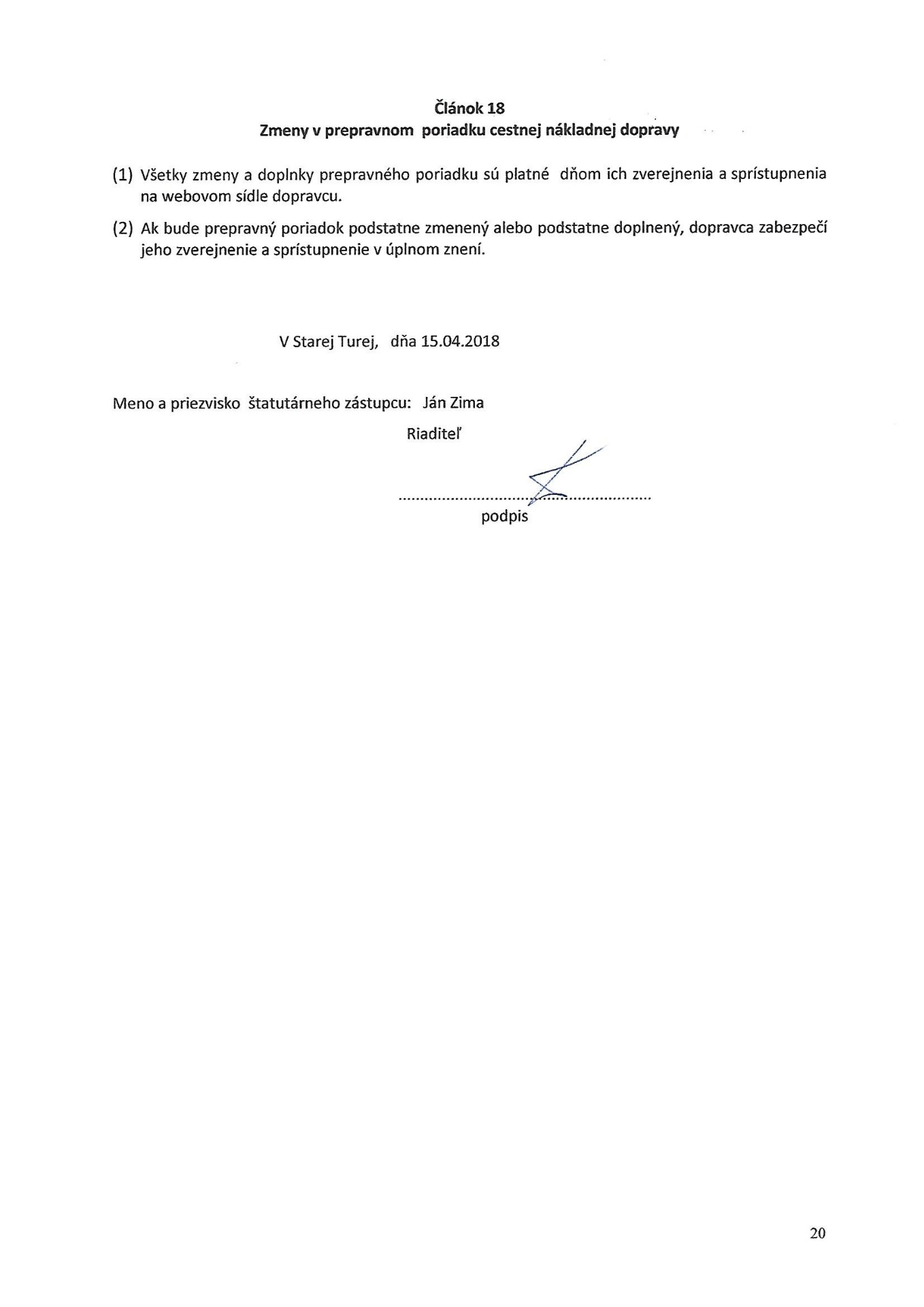 - Dopravcom podľa tohto prepravného poriadku je Ján Zima -AUTODOPRAVA, so sídlom v SNP 3/16,Stará Turá, ktorá podniká v cestnej nákladnej doprave na základe Povolenia Krajského úradu Trenčín a licencie Spoločenstva